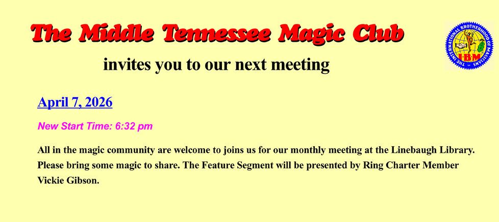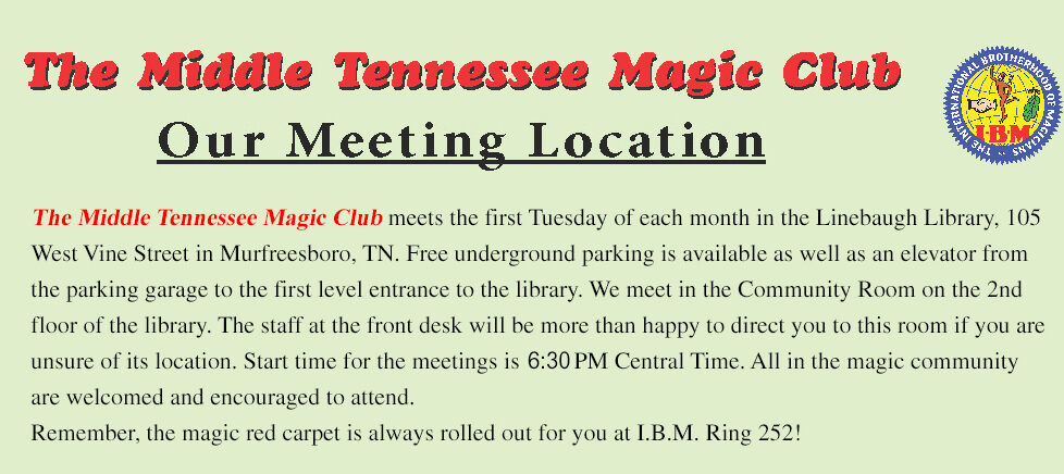We meet the 1st Tuesday of each month (unless otherwise noted on our Meeting Schedule page) at Linebaugh Library, 105 West Vine Street, in Murfreesboro, Tennessee in the new Community Room on the 2nd floor, next to the elevator. Our 2025 meeting dates are shown on the Meeting Schedule page. We encourage anyone with an interest in the magical arts to drop by for a visit to any of our meetings. Any member in good standing of the International Brotherhood of Magicians can apply for membership to the club.