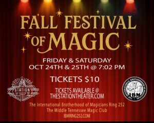 Members of The Middle Tennessee Magic Club will perform the Fall Festival of Magic on October 24 and 25 at The Station Theatre in Smyrna, Tennessee. Each night the show will start at 7:02 pm and tickets are only $10. The cast includes Alan Fisher, John Case, Rob Covert, Adam Sain, David Williams, and Master of Ceremonies Tom Gibson. Visit The Station Theater’s website for detail and tickets.
